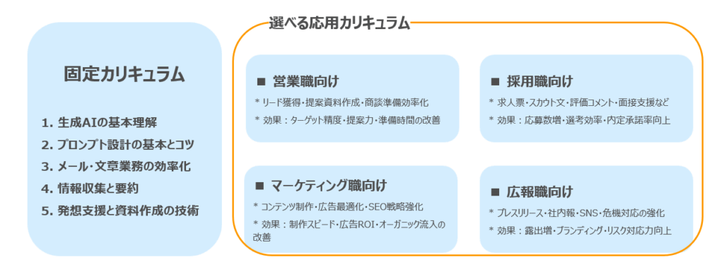 前半の5回では基礎知識と共通スキルを習得し、後半の3回は職種別に応じた応用カリキュラムで実務改善に直結する内容を学びます。